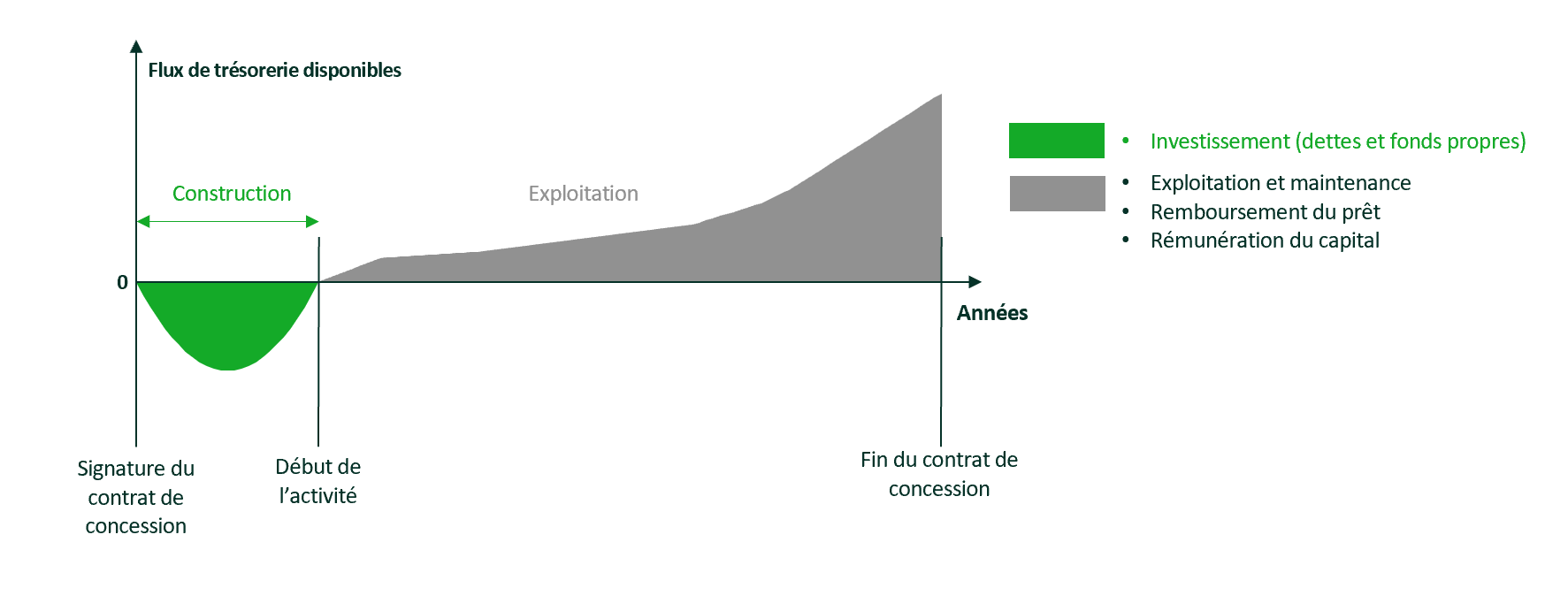 - suivie d’une phase d’exploitation, au cours de laquelle les flux de trésorerie augmentent progressivement pour couvrir les charges d’exploitation et de maintenance, rembourser les créanciers et rémunérer les actionnaires.