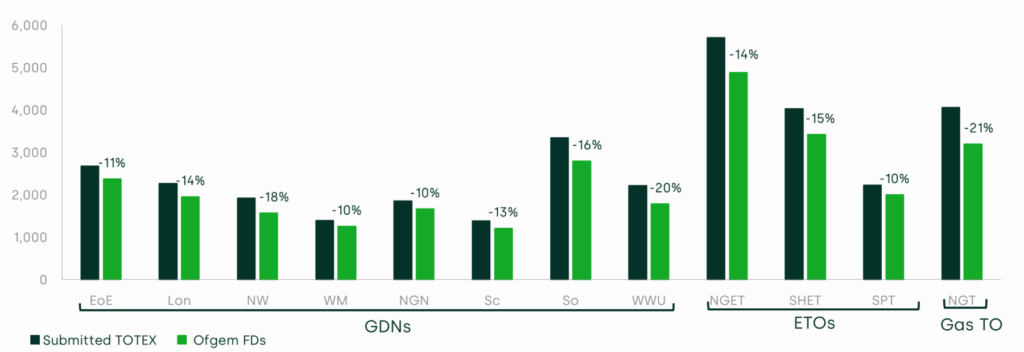 Figure 1 RIIO-3 TOTEX allowances, submitted vs provided in the FDs (£m, 2023/24 prices)