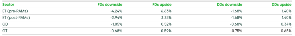 - 26bps and 32bps allowances for additional costs of borrowing for the ET and gas sectors respectively (up from 19bps and 25bps);